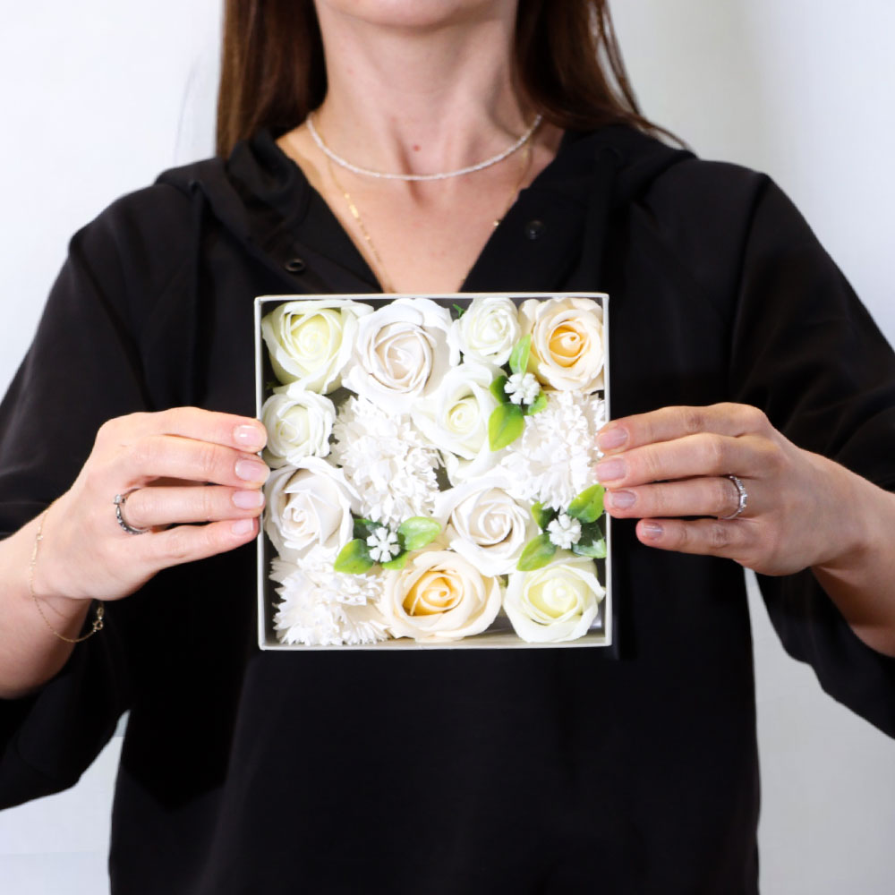 Елегантен букет от сапунени цветя в стилна кутия, с възможност за персонализиран надпис или брандирано лого. Перфектен подарък за специални поводи и корпоративни изненади.